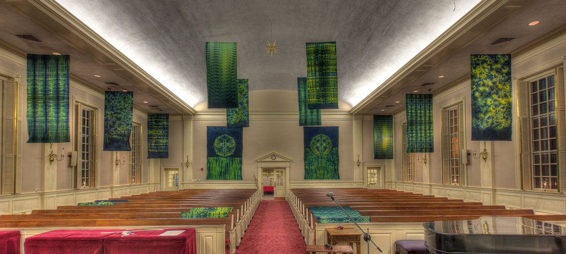 Art Ministry transformed the Sanctuary with an installation of tie dyed banners. This view is looking toward the rear of the sanctuary. Each banner is 4×9 feet except for the two on the rear wall which are 8×12 feet.