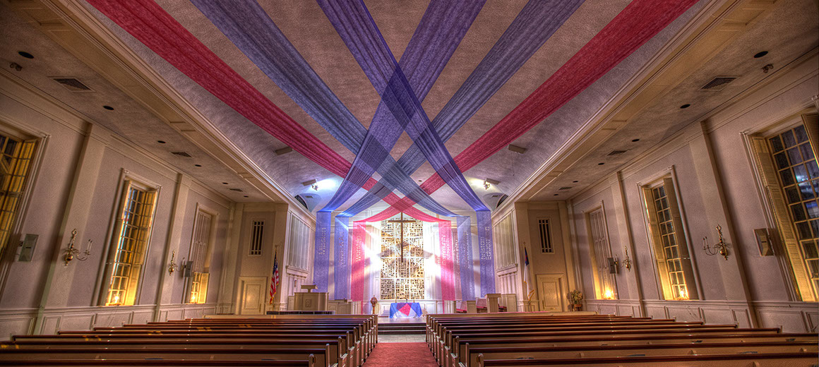 Over the past year we have installed hanging systems in the ceiling and side aisle cornices. These 18 foot banners were hand painted by the Art Ministry team with the help of the confirmation class. The multicolored fabric over the stained glass window was inexpensive polyester, but it's transparent quality and sheen transformed the light in the sanctuary for Pentecost services.