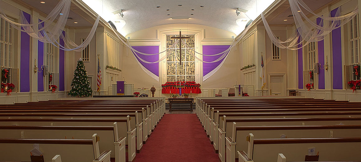 For Advent 2014 we replaced our venerable paper installation with purple fabric, and included the rear wall of the sanctuary in our design. The trinity symbol seen at the top of the rear wall installation is cut from cardboard.