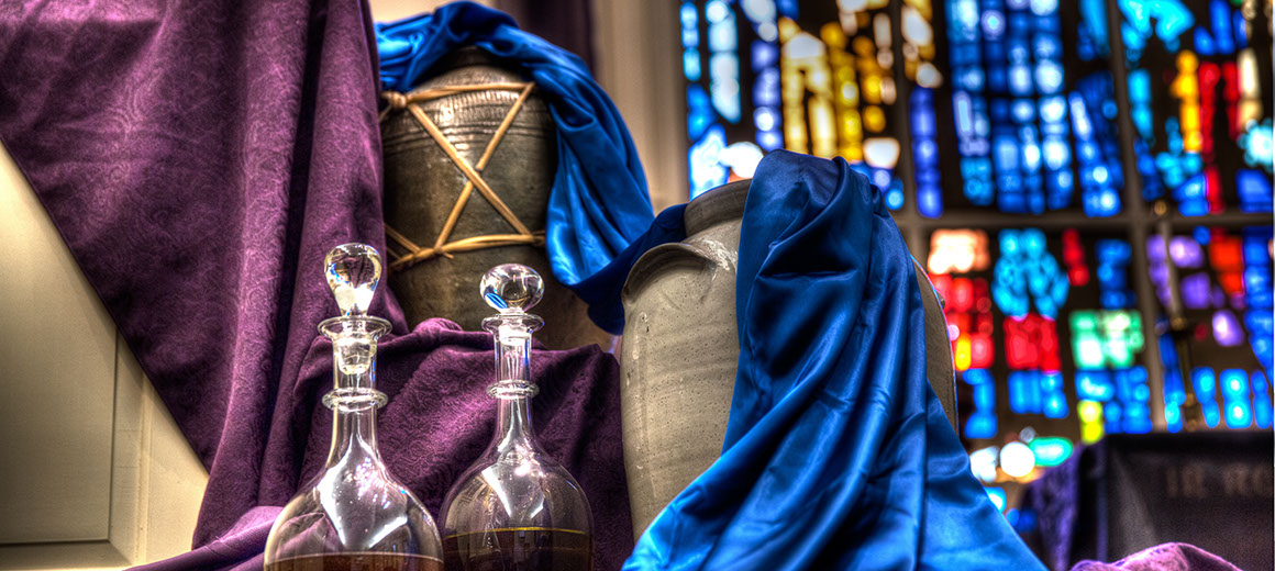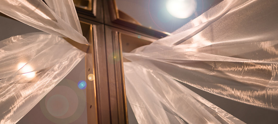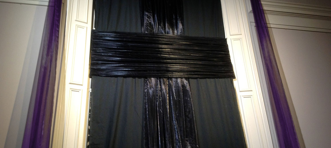 During the course of the 6 Sundays in Lent, we drape the main stained glass window with black muslin fabric, one layer per week, progressively shutting out the light. During the final 2 weeks a black organza cross is added, fully concealing the body of Christ. At the same time, the side windows are draped in black and purple organza.