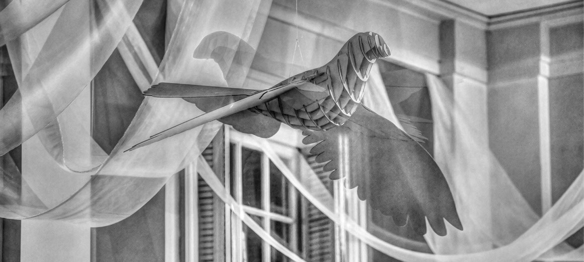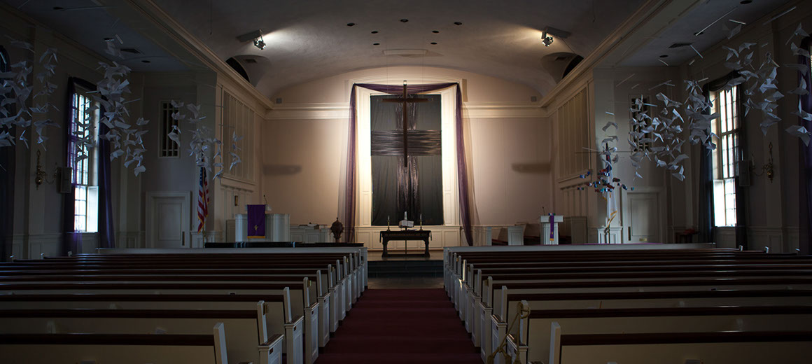 Offsetting the somber darkening of the sanctuary, a series of 6 mobiles were constructed. Each mobile carried 50 handmade origami doves; the wide top bar of each mobile was 8 feet long. Each week before the service one mobile was spread out on a table so that congregants could write prayers on the paper doves; during the service the mobile was lifted up and installed in the sanctuary. The natural air currents in the sanctuary add gentle motion to the mobiles.