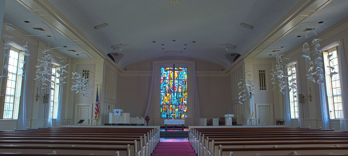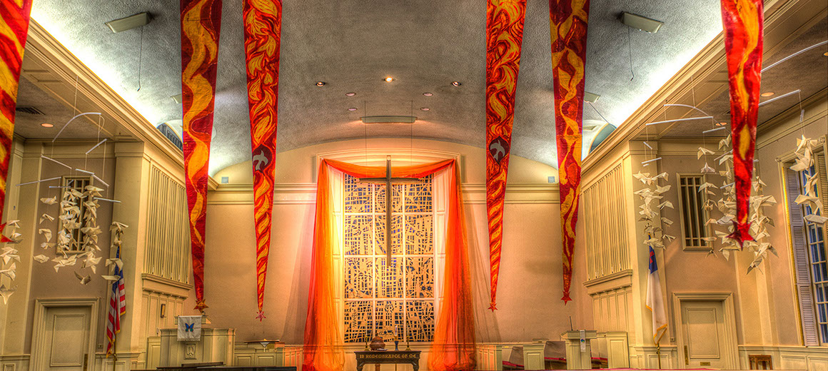 Probably one of our more elaborate installations, Pentecost is as it should be–over the top. Flaming. Overwhelming and joyous, startling and spectacular. Our fabric installation on the rear wall and the fabric over the main window constitute walls of flame, the life giving fire of the Holy Spirit. Likewise the hanging banners envelop the entire sanctuary with their bright colors, nearly touching us in our worship gathering. The medallions on either side of the main window are painted representations of the dove that descended on Christ as he came up from baptism by John the Baptist. They are meant to signal change, redemption, a new beginning, and a surrender of our old way of life as we become new members of god’s family and walk in our new life in the Lord.
